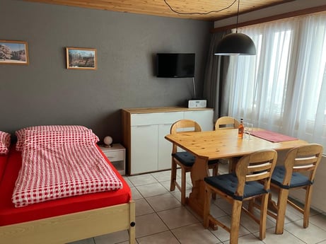 Unser Haus liegt auf 1240 Meter und befindet sich 10 Gehminuten von der Talstation der Bergbahn Twing-Käserstatt entfernt. Zur Bushaltestelle